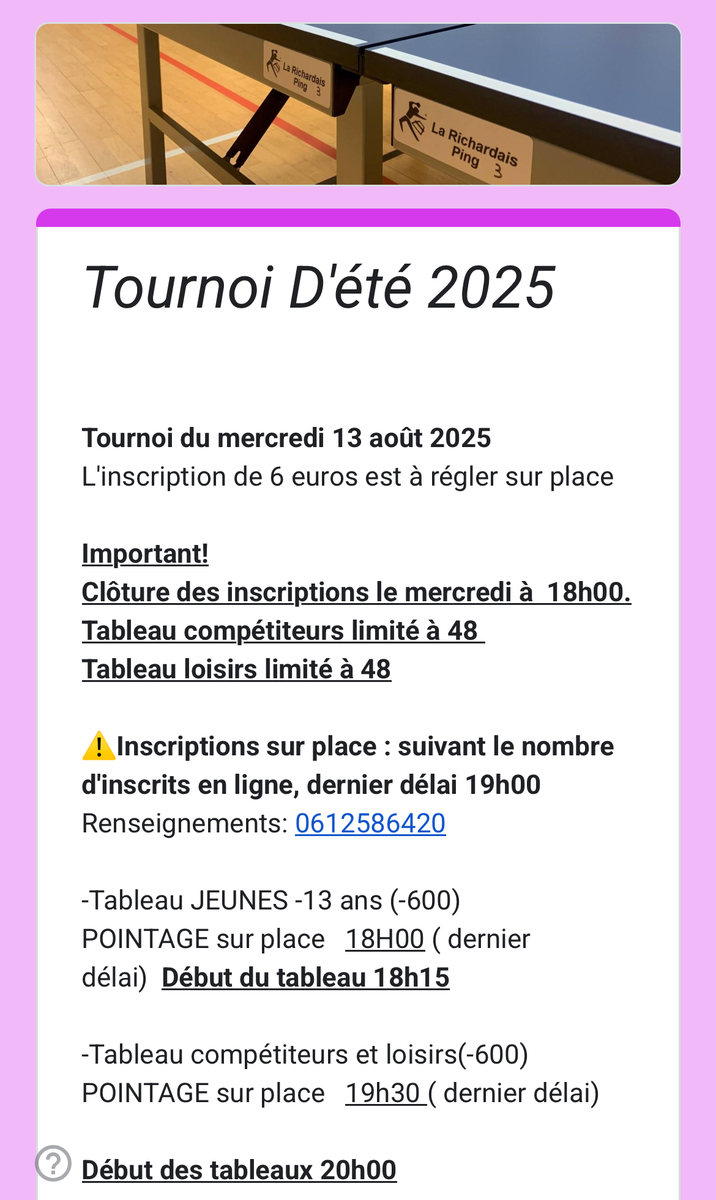 Voici le lien pour les inscriptions au tournoi du 13 août.😀 Belle semaine à tous , à mercredi 👍